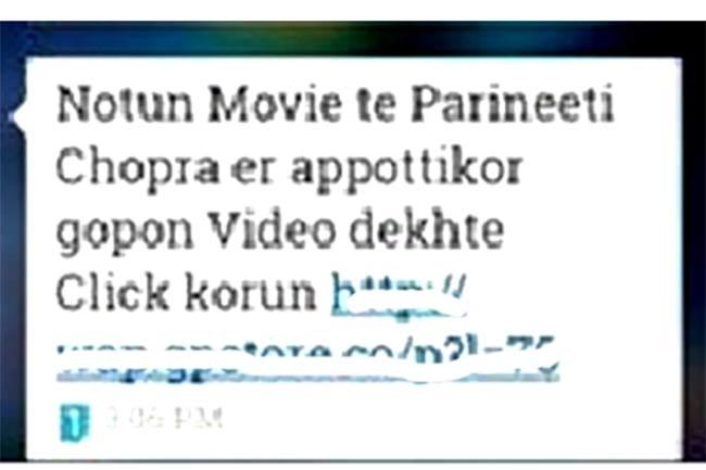 সিলেটটুডে ডেস্ক : ‘জিপি স্টোর’ থেকে ওই বার্তা গ্রাহকদের কাছে পাঠানো হয়। বার্তায় বলা হয়, ‘নতুন মুভিতে পরিণতি চোপড়ার আপত্তিকর গোপন ভিডিও দেখতে ক্লিক করুন…।’