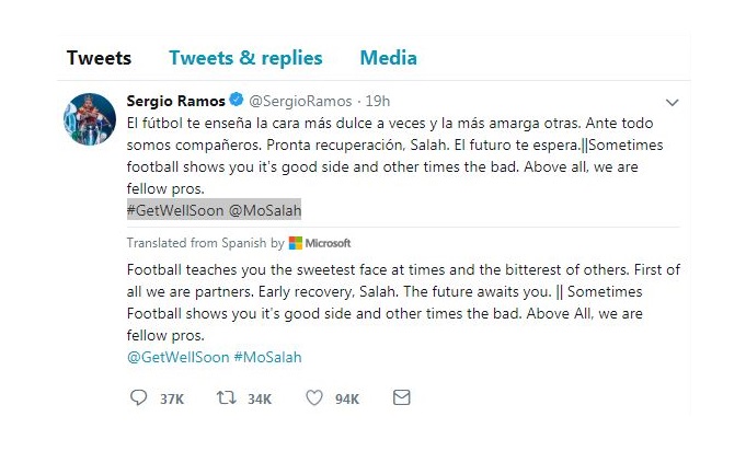 সিলেটটুডে ডেস্ক : চ্যাম্পিয়ন্স লিগের ফাইনালে রিয়াল মাদ্রিদ অধিনায়ক সার্জিও রামোসের কড়া ট্যাকলে আহত লিভারপুলের মিশরিয় ফরোয়ার্ড মোহাম্মদ সালাহর দ্রুত আরোগ্য কামনা করে টুইট করেছেন রামোস। ইনজুরিতে পড়ে ম্যাচের ৩০ মিনিটের মাথায় মাঠ ছাড়তে হয় সালাহকে। এমনকি সালাহর বিশ্বকাপে খেলা নিয়ে অনিশ্চয়তা দেখা দেয়। ওই ম্যাচে রিয়াল লিভারপুলকে ৩-১ গোলে হারিয়ে চ্যাম্পিয়ন হয়।