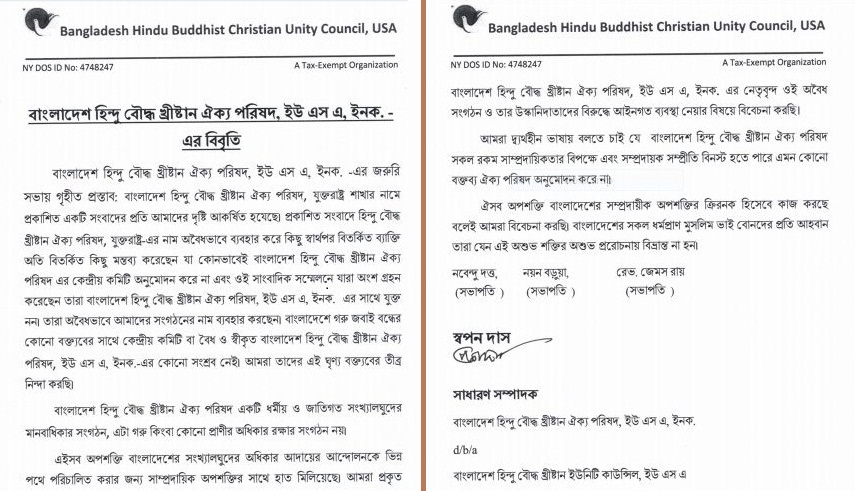 বাংলাদেশ হিন্দু বৌদ্ধ খ্রিস্টান ঐক্য পরিষদ, ইউ এস এ, ইনক. -এর জরুরি সভায় গৃহীত প্রস্তাবের আলোকে সাধারণ সম্পাদক স্বপন দাস সাক্ষরিত এক সংবাদ বিজ্ঞপ্তিতে বলা হয়- বাংলাদেশ হিন্দু বৌদ্ধ খ্রিস্টান ঐক্য পরিষদ, যুক্তরাষ্ট্র শাখার নামে প্রকাশিত একটি সংবাদের প্রতি আমাদের দৃষ্টি আকর্ষিত হরেছে। প্রকাশিত সংবাদে হিন্দু বৌদ্ধ খ্রিস্টান ঐক্য পরিষদ, যুক্তরাষ্ট্র-এর নাম অবৈধভাবে ব্যবহার করে কিছু স্বার্থপর বিতর্কিত ব্যক্তি অতি বিতর্কিত কিছু মন্তব্য করেছেন যা কোনভাবেই বাংলাদেশ হিন্দু বৌদ্ধ খ্রিস্টান ঐক্য পরিষদ এর কেন্দ্রীয় কমিটি অনুমোদন করে না এবং ওই সাংবাদিক সম্মেলনে যারা অংশ গ্রহণ করেছেন তারা বাংলাদেশ হিন্দু বৌদ্ধ খ্রিস্টান ঐক্য পরিষদ, ইউ এস এ, ইনক. এর সাথে যুক্ত নন।