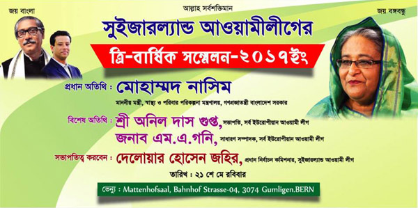 রোববার সুইজারল্যাণ্ড আওয়ামী লীগের সম্মেলন অনুষ্ঠিত হতে যাচ্ছে। সরকারি সফরে আসা স্বাস্থ্য মন্ত্রী ও দলটির প্রেসিডিয়াম সদস্য মোহাম্মদ নাসিম সম্মেলনে প্রধান অতিথি থাকবেন।