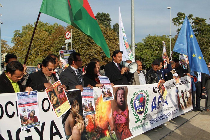 বাংলাদেশ সীমান্তবর্তী মিয়ানমারের রাখাইন রাজ্যে নিরীহ রোহিঙ্গা জনগোষ্ঠীর উপর মিয়ানমার সরকার কর্তৃক পরিচালিত নৃশংস গণহত্যার প্রতিবাদে এবং এতদঞ্চলে চলমান ন্যক্কারজনক এই ‘মানবতাবিরোধী অপরাধ’ বন্ধের লক্ষ্যে সুইজারল্যান্ডের জেনেভায় ১৫ সেপ্টেম্বর শুক্রবার দিনভর ব্যাপক সাংগঠনিক কর্মসূচি পালন করেছে ইউরোপের ৩০টি দেশের বাংলাদেশীদের প্রধান কমিউনিটি সংগঠন অল ইউরোপিয়ান বাংলাদেশ এসোসিয়েশন (আয়েবা)।