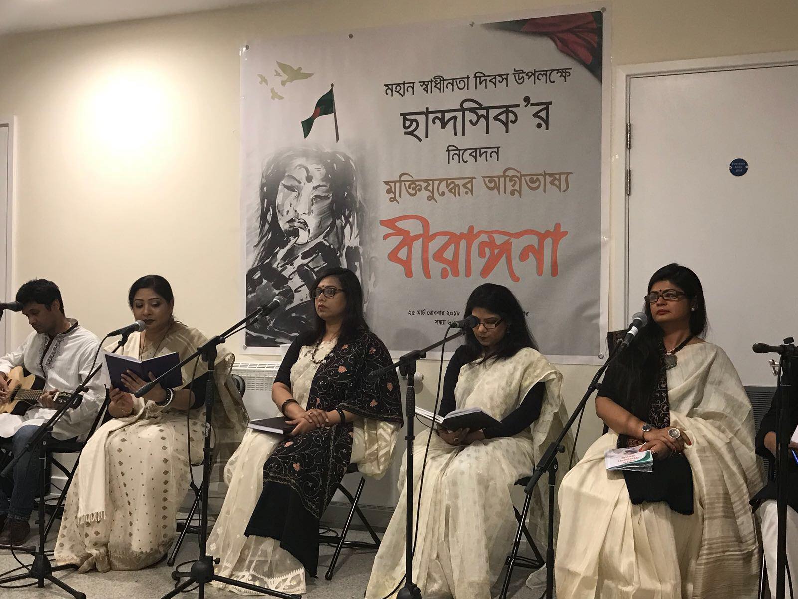 অনুষ্ঠানটির দুটি বিশেষত্ব ছিল আমার কাছে- প্রথমটা হলো এখানে যাঁরা এসেছেন তাঁরা বোধের তাগিদেই এসেছেন। এবং সবাই অনুষ্ঠানের প্রতি একাত্ম হয়ে শুনতেই এসেছেন। পেছনের টাঙানো ব্যানারটাও দিয়েছে উজাড় করা শ্রদ্ধা-আবহ। অনুষ্ঠানের শিরোনাম -মহান স্বাধীনতা দিবসের ছান্দসিক‘র নিবেদন-‘বীরাঙ্গনা‘। সাথে ছিল একজন সাহসী নারীর বিমূর্ত ছবি। উপরে লাল - সবুজ পতাকা; তার উপরে ওড়ছে কয়েকটি পাখি…..।