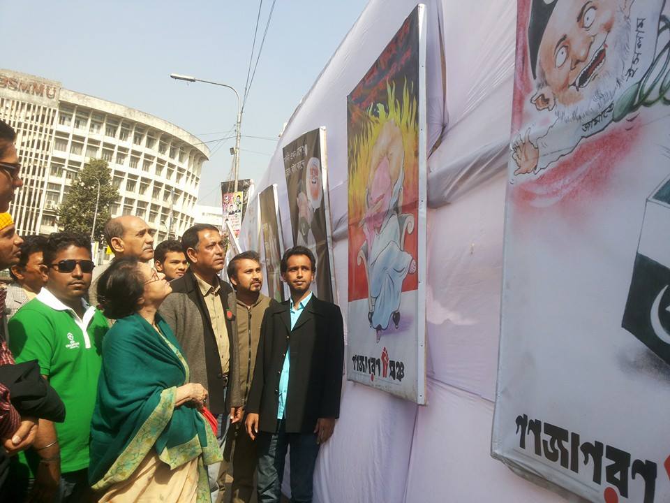 গণজাগরণ মঞ্চের দ্বিতীয় প্রতিষ্ঠাবার্ষিকী উপলক্ষে এক কার্টুন প্রদর্শনী উদ্বোধন করা হয় মঙ্গলবার। রাজধানীর শাহবাগে ‘জামায়াত-বিএনপির জঙ্গীবাদ ও স্বৈরাচারের বিরুদ্ধে রুখে দাঁড়াও’ শীর্ষক এ কার্টুন প্রদর্শনীর আয়োজন করে কামাল পাশা চৌধুরীর নেতৃত্বাধীন গণজাগরণ মঞ্চ।
