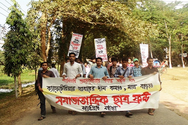 কেন্দ্রীয় ক্যাফেটেরিয়ার খাদ্যদ্রবের দাম কমাতে এবং মান বাড়াতে বিক্ষোভ মিছিল ও সমাবেশ করেছে শাহজালাল বিজ্ঞান ও প্রযুক্তি বিশ্ববিদ্যালয় শাখা সমাজতান্ত্রিক ছাত্রফ্রন্ট।