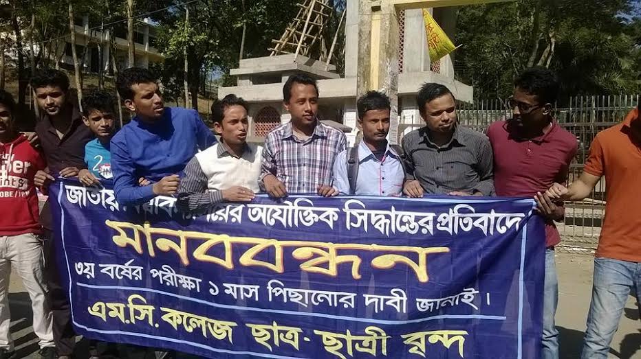 জাতীয় বিশ্ববিদ্যালয়ের অধীনে স্নাতক তৃতীয় বর্ষের পরীক্ষা শিক্ষাবর্ষের মাত্র ছয় (কিছু বিষয়ের ক্ষেত্রে চার) মাসের মাথায় নেওয়ার সিদ্ধান্তের বিরুদ্ধে সারাদেশে স্নাতক শিক্ষার্থীদের প্রতিবাদের একাত্মতা প্রকাশ করে এম.সি. কলেজের শিক্ষার্থীরা আজ শনিবার কলেজ ক্যাম্পাসে এবং ক্যাম্পাসের সামনে মানববন্ধন ও প্রতিবাদ কর্মসূচী পালন করে।