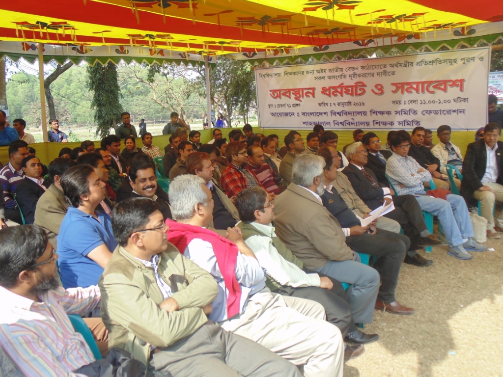 বৃহস্পতিবার সকাল ১১ টা থেকে দুপুর ১টা পর্যন্ত বিশ্ববিদ্যালয়ের চেতনা-৭১ প্রাঙ্গণে এ অবস্থান কর্মসূচি ও সমাবেশ করেন শিক্ষকরা। বাংলাদেশ বিশ্ববিদ্যালয় শিক্ষক সমিতি ফেডারেশনের কেন্দ্রীয় কর্মসূচির অংশ হিসেবে শাহজালাল বিশ্ববিদ্যালয় শিক্ষক সমিতি এ অবস্থান ধর্মঘট ও সমাবেশের আয়োজন করে।