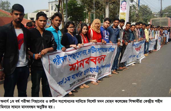 অনার্স ১ম বর্ষের (২০১৪-১৫) ফাইনাল পরীক্ষার রুটিন পেছানোর ও পরিবর্তনের দাবিতে সোমবার দুপুর ১২টায় সিলেট কেন্দ্রীয় শহীদ মিনার প্রাঙ্গণে মদন মোহন কলেজের ১ম বর্ষের শিক্ষার্থীদের উদ্যোগে এক মানব বন্ধন কর্মসূচী অনুষ্ঠিত হয়।