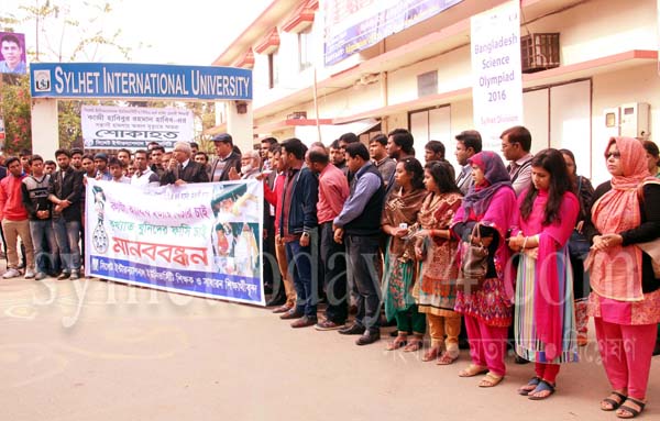 সিলেট ইন্টারন্যাশনাল ইউনিভার্সিটির শিক্ষার্থী কাজী হাবিব হত্যাকাণ্ডে জড়িতদের গ্রেফতার ও শাস্তির দাবিতে মানববন্ধন করেছেন শিক্ষার্থী ও শিক্ষকরা।