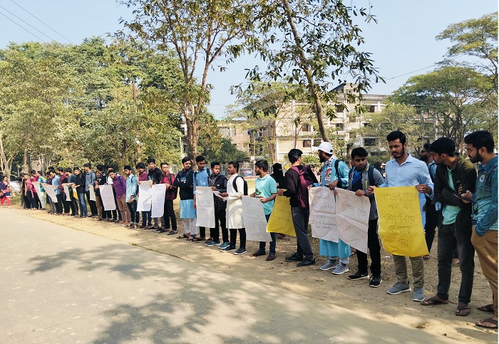 মানববন্ধন কর্মসূচিতে বিশ্ববিদ্যালয়ের সমাজকর্ম বিভাগের দ্বিতীয় বর্ষের শিক্ষার্থী আজাদ শিকদারের সঞ্চালনায় বক্তব্য দেন রসায়ন বিভাগের স্নাতকোত্তরের শিক্ষার্থী আসাদুল্লাহ আল গালিব, ব্যবসায় প্রশাসন বিভাগের তৃতীয় বর্ষের মাহবুবুল হাসান, সমাজবিজ্ঞানের তৃতীয় বর্ষের ফয়সাল হোসেন প্রমুখ।