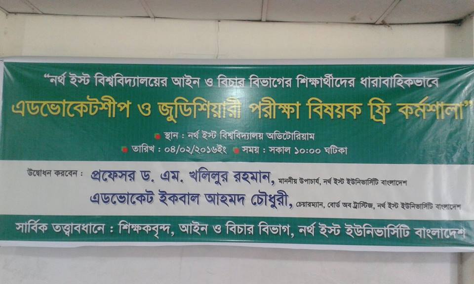 নর্থ ইস্ট ইউনিভার্সিটি এর আইনও বিচার বিভাগের সকল ছাত্রছাত্রীদের এডভোকেটশীপও জুডিসিয়ারী পরীক্ষায় আগাম প্রস্থুত করার লক্ষে আইনও বিচার বিভাগের শিক্ষকদের উদ্যেগে বৃহস্পতিবার সকাল ১০ টায় বিশ্ববিদ্যালের অডিটোরিয়ামে এ কর্মশালার উদ্বোধন করেন নর্থ ইস্ট ইউনিভার্সিটির উপাচার্য প্রফেসর ড.এম খলিলুর এবং ট্রাস্টি বোর্ডের মাননীয় চেয়ারম্যান এডভোকেট ইকবাল ইকবাল আহমদ চৌধুরী।