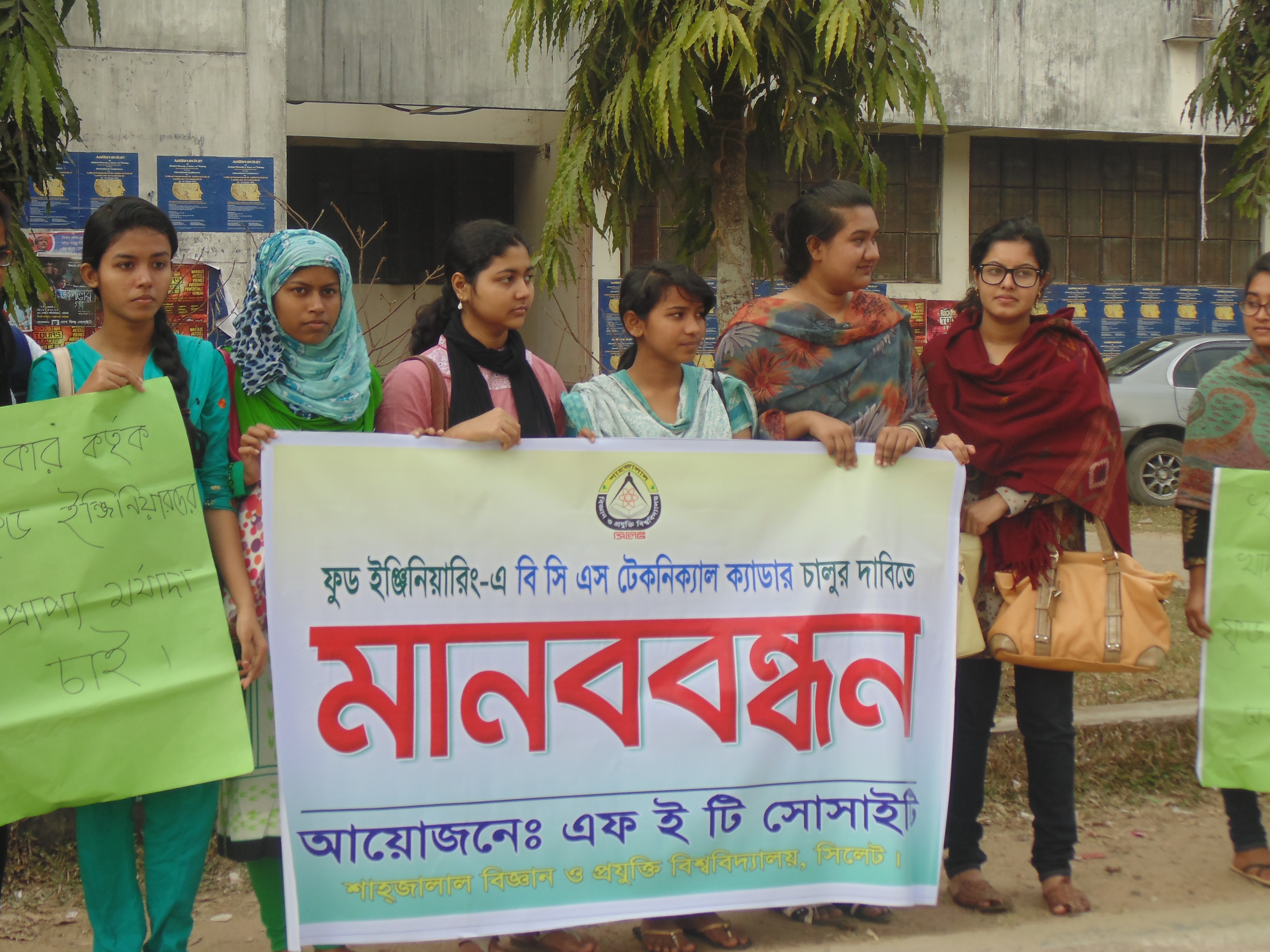 বাংলাদেশ সিভিল সার্ভিস (বিসিএস) এ ফুড ক্যাডারে ফুড ইঞ্জিনিয়ারিং এর শিক্ষার্থীদের নিয়োগের দাবি জানিয়েছে শাহজালাল বিজ্ঞান ও প্রযুক্তি বিশ্ববিদ্যালয়ের ফুড ইঞ্জিনিয়ারিং এন্ড টি টেকনোলজি(এফইটি) বিভাগের শিক্ষার্থীরা। বুধবার এক মানববন্ধন পরবর্তী সমাবেশ থেকে এ দাবি জানান শিক্ষার্থীরা।