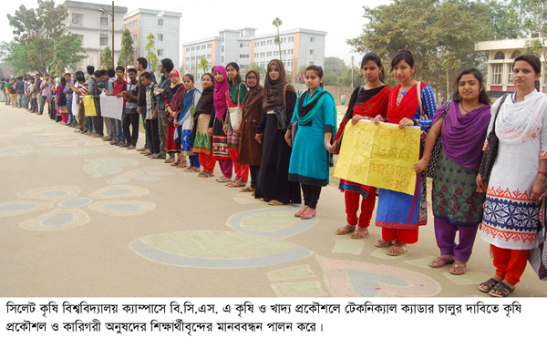সিলেট কৃষি বিশ্ববিদ্যালয় ক্যাম্পাসে বি.সি.এস. এ কৃষি ও খাদ্য প্রকৌশলে টেকনিক্যাল ক্যাডার চালুর দাবিতে বুধবার দুপুর ১২টায় বিশ্ববিদ্যালয় ক্যাম্পাসে কৃষি প্রকৌশল ও কারিগরী অনুষদের শিক্ষার্থীরা মানববন্ধন করে।