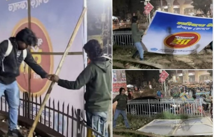 ঢাকা বিশ্ববিদ্যালয়ের রাজু ভাস্কর্যের সামনে থেকে বাংলাদেশ ইসলামী ছাত্রশিবিরের গণভোটে ‘হ্যাঁ’ এর প্রচারণার বিলবোর্ড উৎপাটন করেছে বাংলাদেশ ছাত্র ইউনিয়ন (একাংশ)।