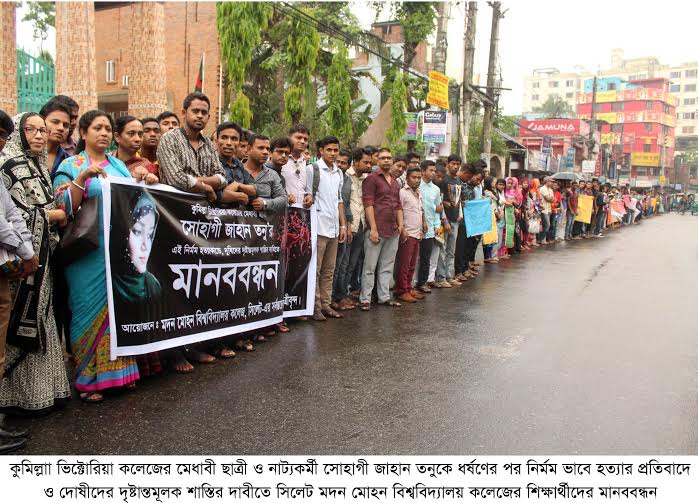 কুমিল্লাা ভিক্টোরিয়া কলেজের মেধাবী ছাত্রী ও নাট্যকর্মী সোহাগী জাহান তনুকে ধর্ষণের পর নির্মম ভাবে হত্যার প্রতিবাদে ও দোষীদের দৃষ্টান্তমূলক শাস্তির দাবীতে মানববন্ধন করেছে সিলেট মদন মোহন বিশ্ববিদ্যালয় কলেজের শিক্ষার্থীরা।