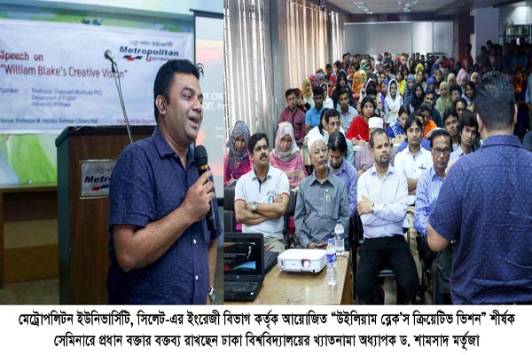 বুধবার মেট্রোপলিটন ইউনিভার্সিটি, সিলেট-এর অধ্যাপক এম. হাবিবুর রহমান লাইব্রেরি হলে ইংরেজি বিভাগের আয়োজনে “উইলিয়াম ব্লেক’স ক্রিয়েটিভ ভিশন” শীর্ষক একটি বিশেষ সেমিনার অনুষ্ঠিত হয়েছে। সেমিনারের প্রধান বক্তা ছিলেন ঢাকা বিশ্ববিদ্যালয়ের খ্যাতনামা অধ্যাপক ড. শামসাদ মর্তূজা।