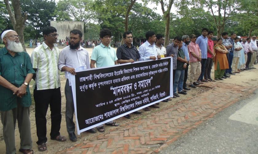 রাজশাহী বিশ্ববিদ্যালয়ের ইংরেজি বিভাগের শিক্ষক অধ্যাপক ড. রেজাউল করিম সিদ্দিকিকে নির্মমভাবে হত্যার প্রতিবাদে ও হত্যাকারীদের অবিলম্বে গ্রেপ্তার দৃষ্টান্তমূলক শাস্তির দাবিতে শাহজালাল বিজ্ঞান ও প্রযুক্তি বিশ্ববিদ্যালয় ক্যাম্পাসে বিক্ষোভ মিছিল ও মানববন্ধন করেছে শাবি শিক্ষক সমিতি।