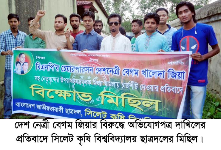 বাংলাদেশ জাতীয়তাবাদী দল বিএনপির চেয়ারপার্সন দেশ নেত্রী বেগম খালেদা জিয়ার বিরুদ্ধে অভিযোগপত্র দাখিলের প্রতিবাদে কেন্দ্রীয় কর্মসূচীর অংশ হিসেবে সিলেট কৃষি বিশ্ববিদ্যালয় ছাত্রদলের উদ্যোগে এক বিক্ষোভ মিছিল বের করা হয়।