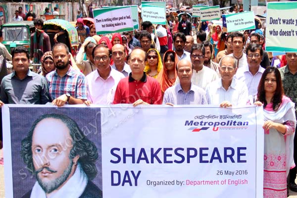 বিশ্বনন্দিত সাহিত্য প্রতিভা শেক্সপীয়রের মৃত্যুর চারশ বছর পূর্তি উপলক্ষে সমগ্র বিশ্বের সাহিত্য ও সংস্কৃতির জগৎ মুখরিত হলেও আমাদের দেশে তেমনভাবে তা পালন হয়নি। মানবসভ্যতার অন্যতম কারিগর ও নাট্যকার শেক্সপীয়রের স্মৃতি ও সৃষ্টির প্রতি বিনম্র শ্রদ্ধা এবং নৈতিক দায়বদ্ধতা থেকে সিলেটে প্রথম বারের মতো ‘শেক্সপীয়র ডে’ পালন করে মেট্রোপলিটন ইউনিভার্সিটি।
