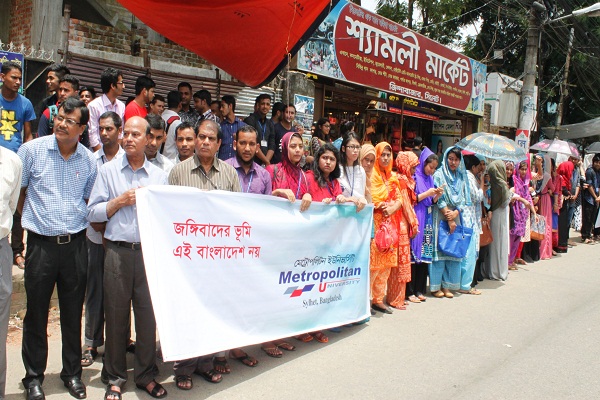 জঙ্গিবাদ ও সন্ত্রাস এর বিরুদ্ধে সামাজিক সচেতনতা ও আন্দোলন গড়ে তোলার লক্ষ্যে দেশের সকল পাবলিক ও প্রাইভেট ইউনিভার্সিটির ন্যায় আজ (১ আগস্ট) সিলেটের মেট্রোপলিটন ইউনিভার্সিটি মানব বন্ধন কর্মসূচি পালন করে।