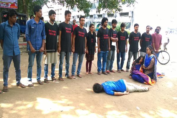 মাস্টার্সের শিক্ষার্থী নাজমুল হাসান রানার সঞ্চালনায় শুরুতেই প্রতিবাদী কবিতা আবৃত্তি করেন একই বিভাগের শিক্ষার্থী বহ্নি মাহবুবা, গোলাম মোস্তফা ও আহমেদ সজীব। পরে প্রতিবাদী পথনাটক মঞ্চস্ত করা হয়। বিশ্ববিদ্যালয়ের বিভিন্ন বিভাগের সাধারণ শিক্ষার্থীরা এ কর্মসূচিতে সংহতি প্রকাশ করে বিচারের জোর দাবি জানান।