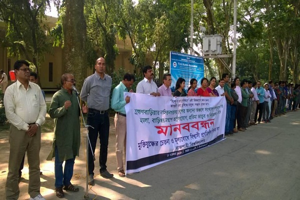 সমাজকর্ম বিভাগের সহযোগী অধ্যাপক রবিউল ইসলামের সঞ্চালনায় মানববন্ধনে আরো বক্তব্য দেন, বাংলা বিভাগের অধ্যাপক ড. সরকার সুজিত কুমার। ঘণ্টাব্যাপী এ মানববন্ধনে বিভিন্ন বিভাগের শতাধিক শিক্ষক-শিক্ষার্থী উপস্থিত ছিলেন।