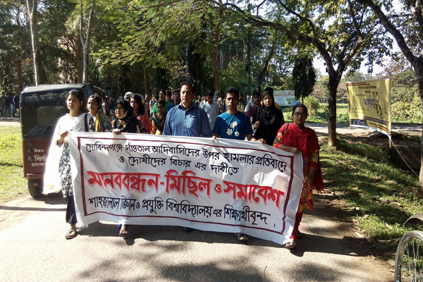গোবিন্ধগঞ্জে সাঁওতাল আদিবাসিদের উপর হামলার প্রতিবাদ ও জড়িতদের বিরুদ্ধে দৃষ্টান্তমূলক শাস্তির দাবি জানিয়েছে শাহজালাল বিজ্ঞান ও প্রযুক্তি বিশ্ববিদ্যালয়ের শিক্ষার্থীরা।