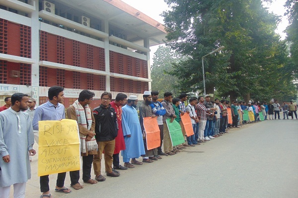 মায়ানমারের রাখাইনে রোহিঙ্গা হত্যাযজ্ঞ বন্ধে মায়ানমার সরকারের ওপর আন্তর্জাতিক সংগঠনের চাপ সৃষ্টি এবং অং সান সুচি’র নোবেল ফিরিয়ে নেওয়ার দাবিতে মানববন্ধন রাজশাহী বিশ্ববিদ্যালয়ের (রাবি) সাধারণ শিক্ষার্থীরা।