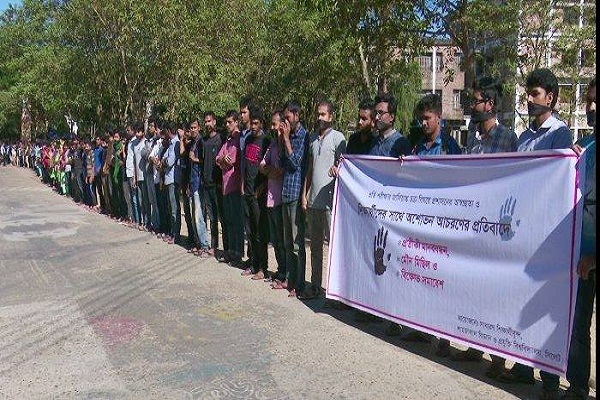 মঙ্গলবার (৬ ডিসেম্বর) দুপুর ১টায় বিশ্ববিদ্যালয়ের কেন্দ্রীয় গ্রন্থাগারের সামনে এ মানববন্ধন অনুষ্ঠিত হয়। মানববন্ধন শেষে মৌন মিছিলটি ক্যাম্পাসের বিভিন্ন সড়ক প্রদক্ষিণ করে প্রশাসনিক ভবনের সামনে এসে সমাবেশে মিলিত হয়।