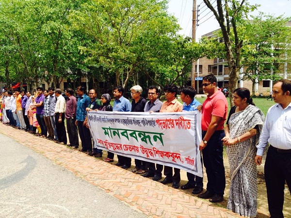 মানববন্ধন কর্মসূচিতে ড.মুহাম্মদ জাফর ইকবাল, ড. ইয়াসমিন হক, ড. ইউনুস , মোস্তাবুর রহমান সহ আন্দোলনরত শিক্ষকরা উপস্থিত ছিলেন।