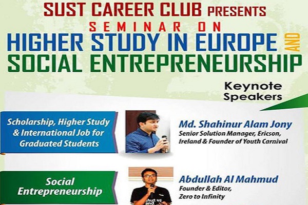 শাহজালাল বিজ্ঞান ও প্রযুক্তি বিশ্ববিদ্যালয়ে (শাবিপ্রবি) ক্যারিয়ার ক্লাবের আয়োজনে অনুষ্ঠিত হতে যাচ্ছে ‘A seminar on higher study in Europe and social entrepreneurship’ শীর্ষক ক্যারিয়ার বিষয়ক সেমিনার।