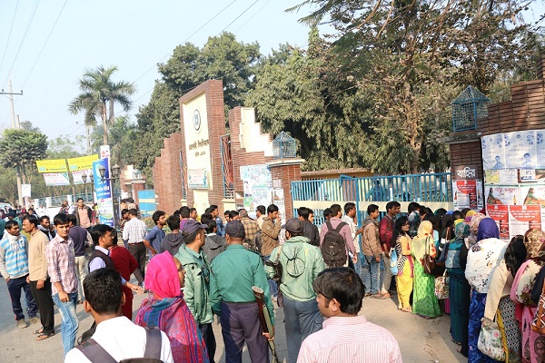 রাজশাহী বিশ্ববিদ্যালয়ে (রাবি) চাকরির দাবিতে প্রধান ফটক বন্ধ করে বিক্ষোভ করেছে স্থানীয় আওয়ামী লীগের নেতাকর্মীরা।