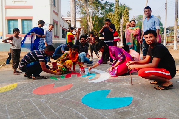 হাটতে গিয়ে ক্যাম্পাসের রাস্তায় পড়লেন মধুর বিপত্তিতে। কারণ মোহনা'র সদস্যরা সদ্য তুলির আঁচড় দিয়ে দৃষ্টিনন্দন আলপনা এঁকেছেন রাস্তাজুড়ে। বিকাল বেলা সূর্য যখন পশ্চিমের আকাশে হেলে পড়েছে তখনও কাজে ব্যস্ত সংগঠনটির কলাকুশলীরা।