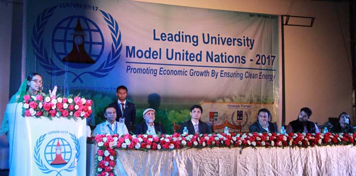 সভাপতির বক্তব্যে লিডিং ইউনিভার্সিটির উপাচার্য প্রফেসর ড. মো: কামরুজ্জামান চৌধুরী বলেন, লিডিং ইউনিভার্সিটির মডেল ইউনাইটেড ন্যাশন এসোসিয়েশন কর্তৃক আয়োজিত এধরনের অনুষ্ঠান আগামীদিনের বলিষ্ঠ নেত্রীত্ব তৈরী করবে যাতে বাংলাদেশের উন্নয়নের একটি প্লাটফর্ম তৈরী হবে । তিনি এই আয়োজনের জন্য লিডিং ইউনিভার্সিটির মডেল ইউনাইটেড ন্যাশন এসোসিয়েশনের উপদেষ্ঠা প্রভাষক তাহরিমা চৌধুরী জান্নাতকে ধন্যবাদ জানান। তিনি এ অনুষ্ঠানে এসে আজকের সম্ভাবনাময় তরুনদেরকে উৎসায়িত করার জন্য এমপি আমাতুল কিবরিয়া কেয়া চৌধুরীকে ধন্যবাদ জানান এবং একটি সন্মামনা স্মরক প্রদান করেন। উপাচার্য লিডিং ইউনিভার্সিটির মডেল ইউনাইটেড ন্যাশন এসোসিয়েশ-২০১৭ এর লগু উদ্বোধন করেন।
