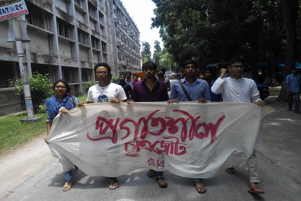 রাজশাহী বিশ্ববিদ্যালয়ে (রাবি) দুই দফা দাবিতে বিক্ষোভ মিছিল করেছে প্রগতিশীল ছাত্রজোট রাবি শাখার নেতা-কর্মীরা।