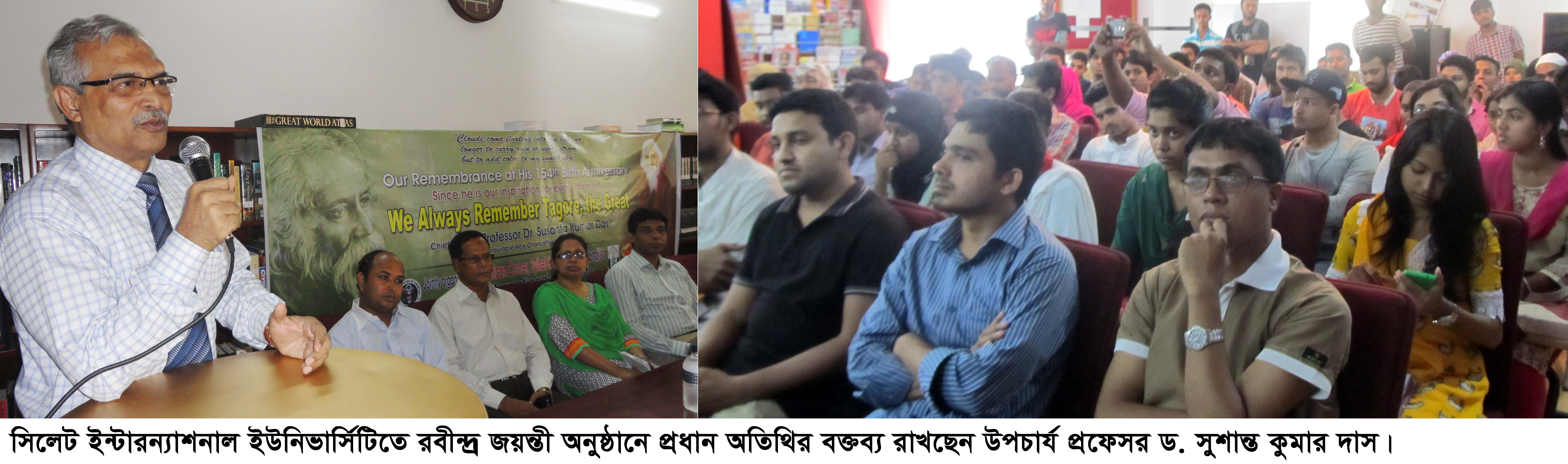 প্রফেসর সুশান্ত গতকাল বুধবার দুপুরে বিশ্ববিদ্যালয়ের ইংরেজী বিভাগ এবং আমেরিকান কর্ণার আয়োজিত বিশ্বকবি রবীন্দ্রনাথ ঠাকুরের ১৫৪ তম জন্মবার্ষিকী উদযাপন অনুষ্ঠানে প্রধান অতিথির বক্তব্যে এসব কথা বলেন। আমেরিকান কর্ণারে আয়োজিত আলোচনা সভায় সভাপতিত্ব করেন ইংরেজী বিভাগের চেয়ারম্যান প্রধান মাহবুব ইবনে সিরাজ। প্রভাষক চৌধুরী সাইমুন আফরোজির স ালনায় অনুষ্ঠানে বিশেষ অতিথি ছিলেন মানবিক অনুষদের ডিন প্রফেসর সৈয়দ মুয়ীজুর রহমান, পরিক্ষা নিয়ন্ত্রক এ.এফ.এম. আমিনুল ইসলাম এবং রেজিস্ট্রার নসরত আফজা চৌধুরী। স্বাগত বক্তব্য রাখেন আমেরিকান কর্ণারের পরিচালক মোস্তফা কামাল। অনুষ্ঠানে রবীন্দ্রনাথের জীবন ও কর্মের বিভিন্ন দিক নিয়ে বক্তব্য রাখেন, আইন বিভাগের সহকারী অধ্যাপক হুমায়ুন কবির ও ইংরেজী বিভাগের সিনিয়র প্রভাষক স্বাতী রানী দেবনাথ।