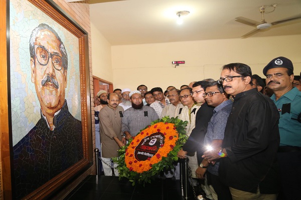 সকাল সাড়ে ৭টায় উপাচার্যের নেতৃত্বে বিশ্ববিদ্যালয় প্রশাসনের ঊর্ধ্বতন কর্মকর্তা, শিক্ষক, শিক্ষার্থী, কর্মকর্তা, কর্মচারীবৃন্দ কালো ব্যাজ ধারণ করেন এবং শোক মিছিল নিয়ে বঙ্গবন্ধু শেখ মুজিবুর রহমান হলে বঙ্গবন্ধুর প্রতিকৃতিতে পুষ্পস্তবক অর্পণ করেন। সেখানে তাঁরা বঙ্গবন্ধুর স্মৃতির প্রতি শ্রদ্ধা জানিয়ে এক মিনিট নীরবতা পালন ও তাঁর রুহের মাগফিরাত কামনা করে মোনাজাত করেন।