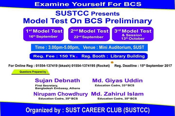 আসন্ন ৩৮তম বিসিএস প্রিলিমিনারি পরীক্ষাকে সামনে রেখে শাহজালাল বিজ্ঞান ও প্রযুক্তি বিশ্ববিদ্যালয়ের অন্যতম ক্যারিয়ার ভিত্তিক সংগঠন ‘সাস্ট ক্যারিয়ার ক্লাব’ ৩টি মডেল টেস্ট ও ১টি জেনারেল সেশনের আয়োজন করতে যাচ্ছে।