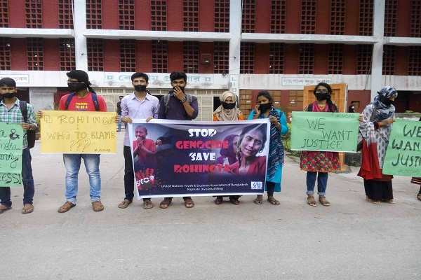 মিয়ানমারের রাখাইনে রোহিঙ্গাদের উপর জাতিগত নিপীড়ন ও অব্যাহত হত্যাযজ্ঞের প্রতিবাদে রাজশাহী বিশ্ববিদ্যালয়ে মৌন-মানববন্ধন ও গণস্বাক্ষর কর্মসূচি পালন করেছে ইউনাইটেড নেশনস্ ইয়ুথ এন্ড স্টুডেন্টস্ এসোসিয়েশন অব বাংলাদেশ (ইউনিস্যাব) রাজশাহী বিভাগীয় শাখা।