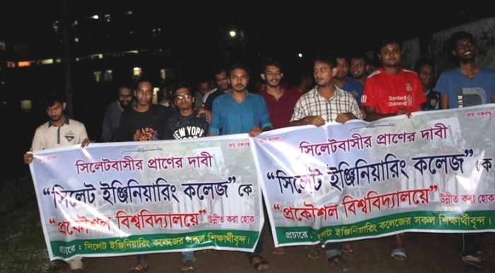 সিলেট ইঞ্জিনিয়ারিং কলেজকে বিশ্ববিদ্যালয়ে রুপান্তর করা হোক- এই ব্যানার হাতে শিক্ষার্থীরা আবাসিক হল থেকে মিছিলটি শুরু করে। পরে মিছিলটি ক্যাম্পাস প্রদক্ষিন করে সমাবেশের মধ্য দিয়ে শেষ হয়।