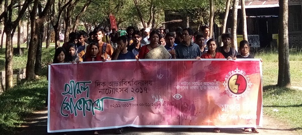 দিক থিয়েটারের সাধারণ সম্পাদক জুয়েল রানা বৃহস্পতিবার সন্ধ্যায় বিশ্ববিদ্যালয়ের কেন্দ্রীয় মিলনায়তনে অনুষ্ঠানের শুরুতে উপস্থিত রাখেন। বাংলাদেশ শিল্পকলা একাডেমির মহাপরিচালক লিয়াকত আলী লাকী ও সম্মিলিত নাট্য পরিষদ সিলেটের সভাপতি মিশকাত আহমেদ চৌধুরী মিশু।