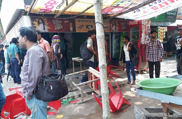 বুধবার বেলা ১২টার দিকে প্রক্টরিয়াল বডি পরিবহন মার্কেটের ক্যাম্পাস ফুড কর্ণার নামের দোকানের অবৈধ বর্ধিত অংশ উচ্ছেদ করতে গেলে এ ঘটনা ঘটে।