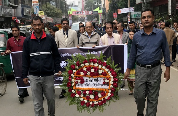 শহীদ বুদ্ধিজীবী দিবস উপলক্ষে জাতির শ্রেষ্ঠ সন্তানদের প্রতি শ্রদ্ধা জানিয়েছে মেট্রোপলিটন ইউনিভার্সিটি। বৃহস্পতিবার সকাল ১১টায় সিলেট নগরীর চৌহাট্টাস্থ শহীদ বুদ্ধিজীবী স্মৃতিস্তম্ভে পুষ্পস্তবক দিয়ে ইউনিভার্সিটির পক্ষ থেকে শ্রদ্ধাঞ্জলি অর্পণ করা হয়।