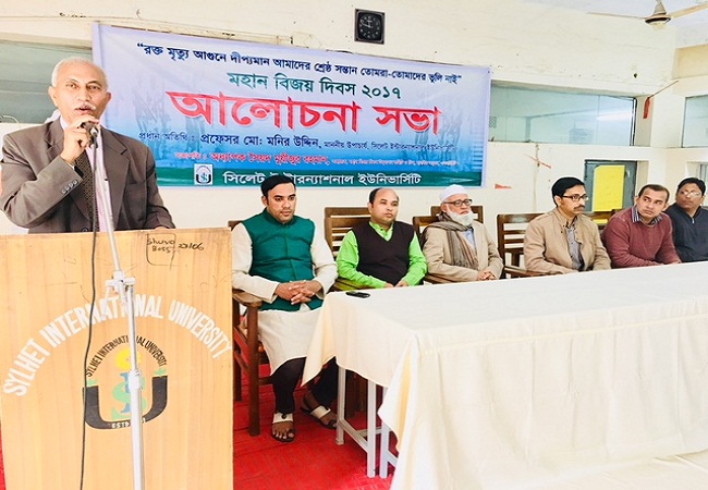 বিজয় দিবস উদযাপন কমিটির আহ্বায়ক ও মানবিক অনুষদের ডিন প্রফেসর সৈয়দ মুয়ীজুর রহমানের সভাপতিত্বে এবং আইন বিভাগের সিনিয়র প্রভাষক সাব্বির আহসান এর পরিচালনায় সভায় প্রধান অতিথি হিসেবে বক্তব্য রাখেন- সিলেট ইন্টারন্যাশনাল ইউনিভার্সিটির ভারপ্রাপ্ত উপাচার্য প্রফেসর মো: মনির উদ্দিন।