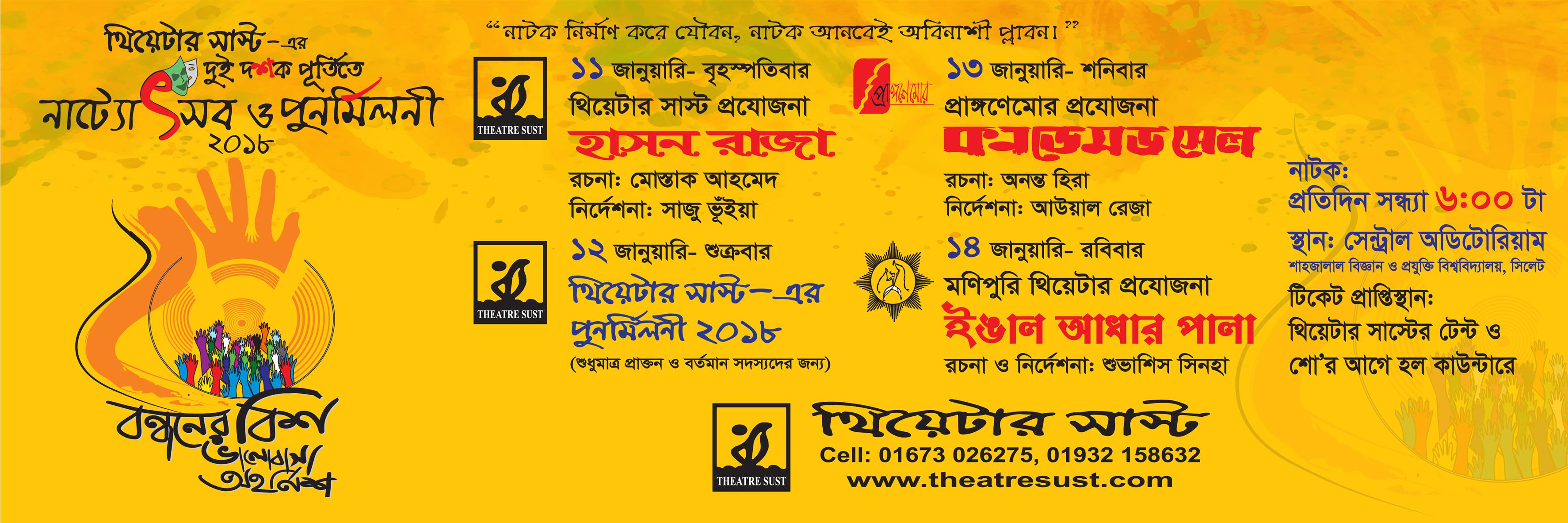 ‘থিয়েটার সাস্ট’ এর নিজস্ব প্রযোজনার পাশাপাশি ১৩ জানুয়ারি উৎসবে থাকছে প্রাঙ্গণেমোর এর নাটক ‘কনডেমড সেল’ ও ১৪ জানুয়ারি ‘মণিপুরি থিয়েটার’ এর নাটক ‘ইঙ্গাল আধার পালা’।