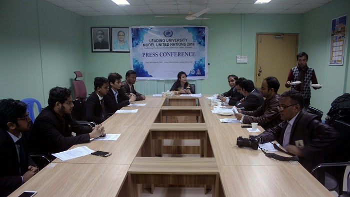ছায়া জাতিসংঘ সম্মেলন উপলক্ষে রোববার সকালে বিশ্ববিদ্যালয়ের সুরমা টাওয়ার ক্যাম্পাসে সংবাদ সম্মেলনের আয়োজন করা হয়। এতে বক্তব্য রাখেন লিডিং ইউনিভার্সিটি ছায়া জাতিসংঘ এসোসিয়েশনের উপদেষ্টা তাহরিমা চৌধুরী জান্নাত।