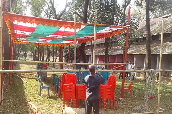 সোমবার বিকেলে বইমেলা প্রাঙ্গণ ঘুরে দেখা গেলো মেলার স্টল, মঞ্চ সাজানোর শেষ প্রস্তুতির কাজ সারছেন বইমেলার আয়োজক মুরারিচাঁদ কবিতা পরিষদের কর্মীরা।