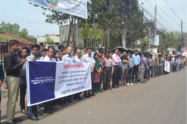 মেট্রোপলিটন ইউনিভার্সিটির বোর্ড অব ট্রাস্টিজের চেয়ারম্যান ড. তৌফিক রহমান চৌধুরীর সভাপতিত্বে মানববন্ধনে উপস্থিত ছিলেন ভারপ্রাপ্ত উপাচার্য অধ্যাপক শিব প্রসাদ সেন, রেজিস্ট্রার মোহাম্মদ ফজলুর রব তানভীর, ব্যবসা ও অর্থনীতি অনুষদের ডিন অধ্যাপক ড. তাহের বিল্লাল খলিফা, বিজ্ঞান ও প্রযুক্তি অনুষদের ডিন অধ্যাপক ড. নজরুল হক চৌধুরী, আইন ও বিচার বিভাগের ডিন অধ্যাপক ড. রবিউল হোসেন, পরীক্ষা নিয়ন্ত্রক অধ্যাপক নন্দলাল শর্মা, সিএসই বিভাগের প্রধান চৌধুরী মো. মোকাম্মেল ওয়াহিদ, ইইই বিভাগের প্রধান সহকারি অধ্যাপক মিয়া মো. আসাদুজ্জামান, আইন ও বিচার বিভাগের প্রধান সহকারি অধ্যাপক শেখ আশরাফুর রহমান, পরিচালক (অর্থ) মিহির কান্তি চৌধুরী, পরিচালক (প্রশাসন) তারেক ইসলাম, সহকারি রেজিস্ট্রার ও জনসংযোগ কর্মকর্তা লোকমান আহমদ চৌধুরী, খন্দকার মকসুদ আহমদ প্রমুখ। মানববন্ধনে বিভিন্ন অনুষদের ডিন, বিভাগীয় প্রধানসহ অন্যান্যরা অংশগ্রহণ করেন।