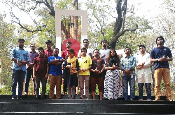 বৃহস্পতিবার (১৫ মার্চ) দুপুরে কলেজের কেন্দ্রীয় শহিদ মিনারে এ কর্মসূচি পালন করে নাট্যসংগঠনটি।