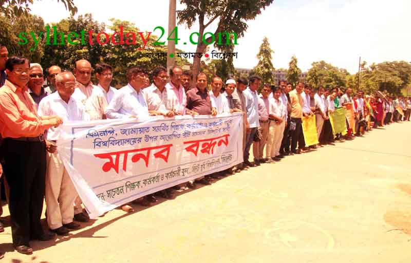 সিলেট কৃষি বিশ্ববিদ্যালয়ের ৮৪ জন শিক্ষক ও কর্মকর্তার নিয়োগের বিরুদ্ধে উচ্চ আদালতে দায়েরকৃত রিট আবেদন প্রত্যাহারের দাবিতে মানববন্ধন করেছেন শিক্ষক ও কর্মকর্তারা। এই ইস্যুতে ধারাবাহিক আন্দোলনের অংশ হিসেবে মঙ্গলবার দুপুরে ক্যাম্পাসে মানববন্ধন কর্মসূচি পালন করা হয়।