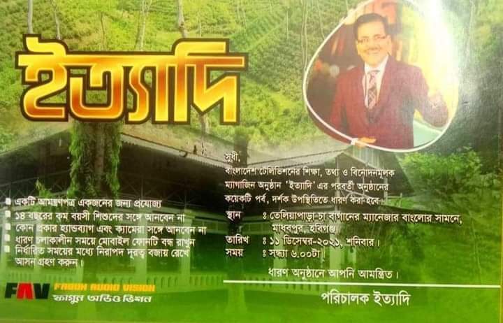 বিটিভিতে প্রচারিত জনপ্রিয় ম্যাগাজিন অনুষ্ঠান ইত্যাদি এবার অনুষ্ঠিত হবে হবিগঞ্জের মাধবপুর উপজেলার তেলিয়াপাড়া চা বাগানের মুক্তিযুদ্ধ স্মৃতিসৌধ এলাকায়।